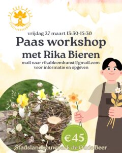 Op vrijdag 27 maart trapt Rika Bieren het workshopseizoen af op Stadslandbouwpark De Oude Beer. Tijdens deze middag creëert u onder professionele begeleiding een paasstuk, waarbij zoveel mogelijk gebruik word gemaakt van de bloemen op de tuin.